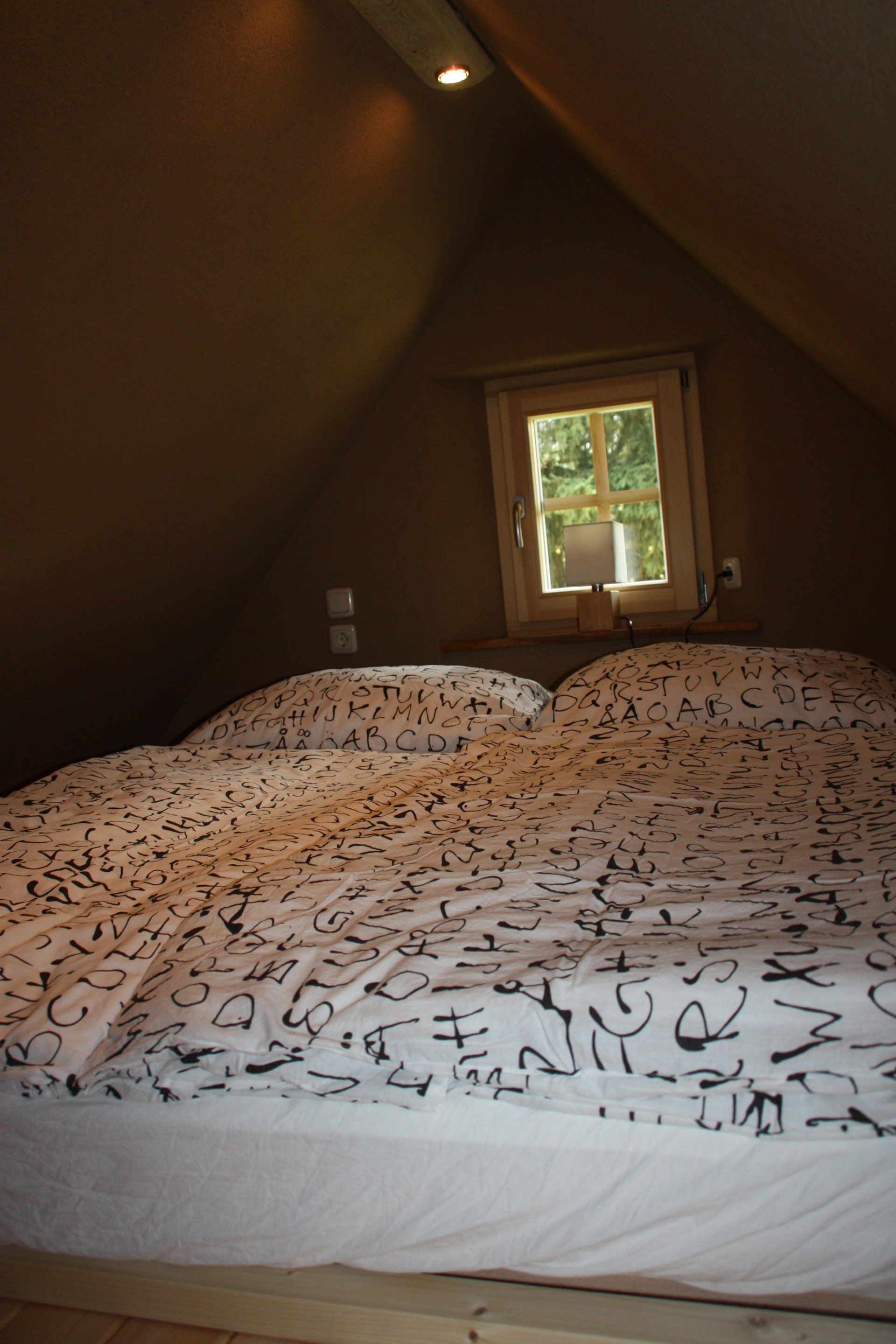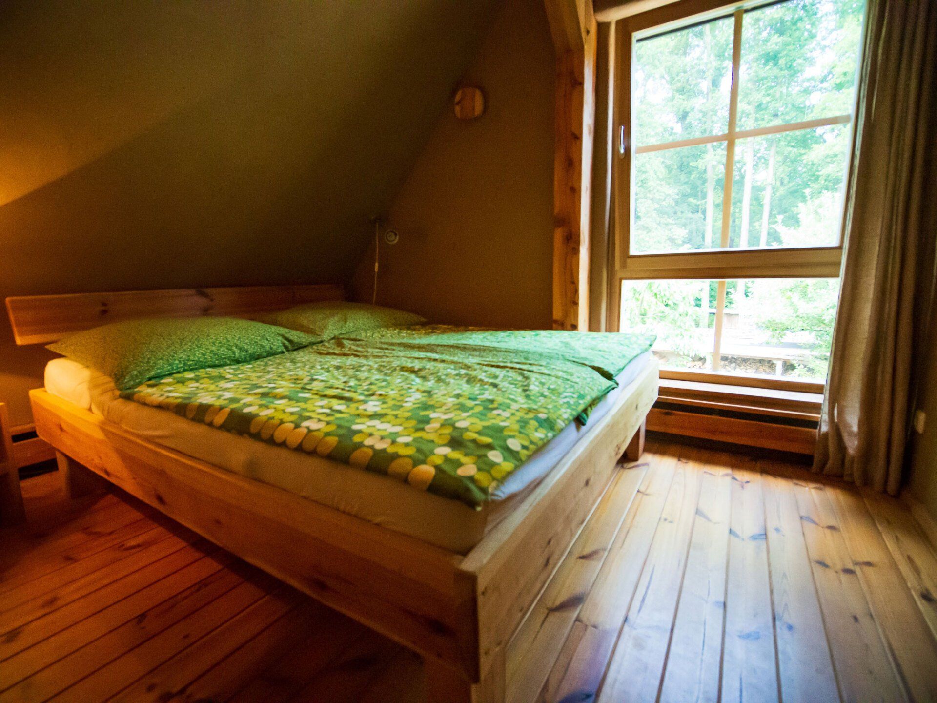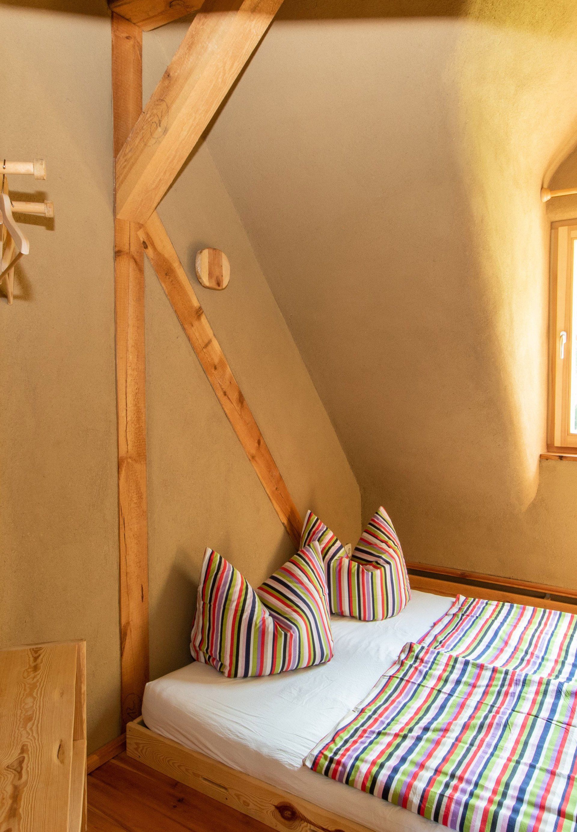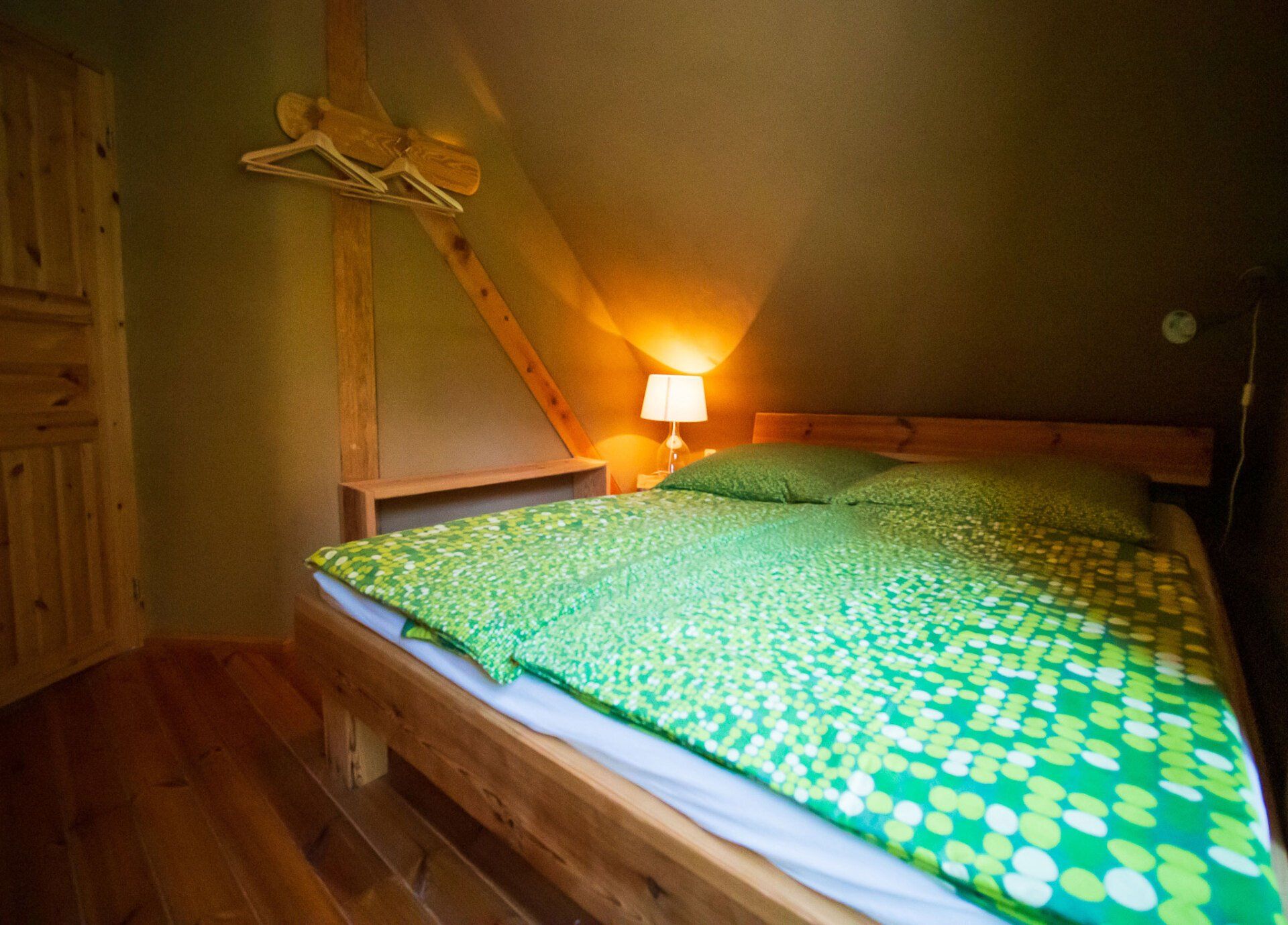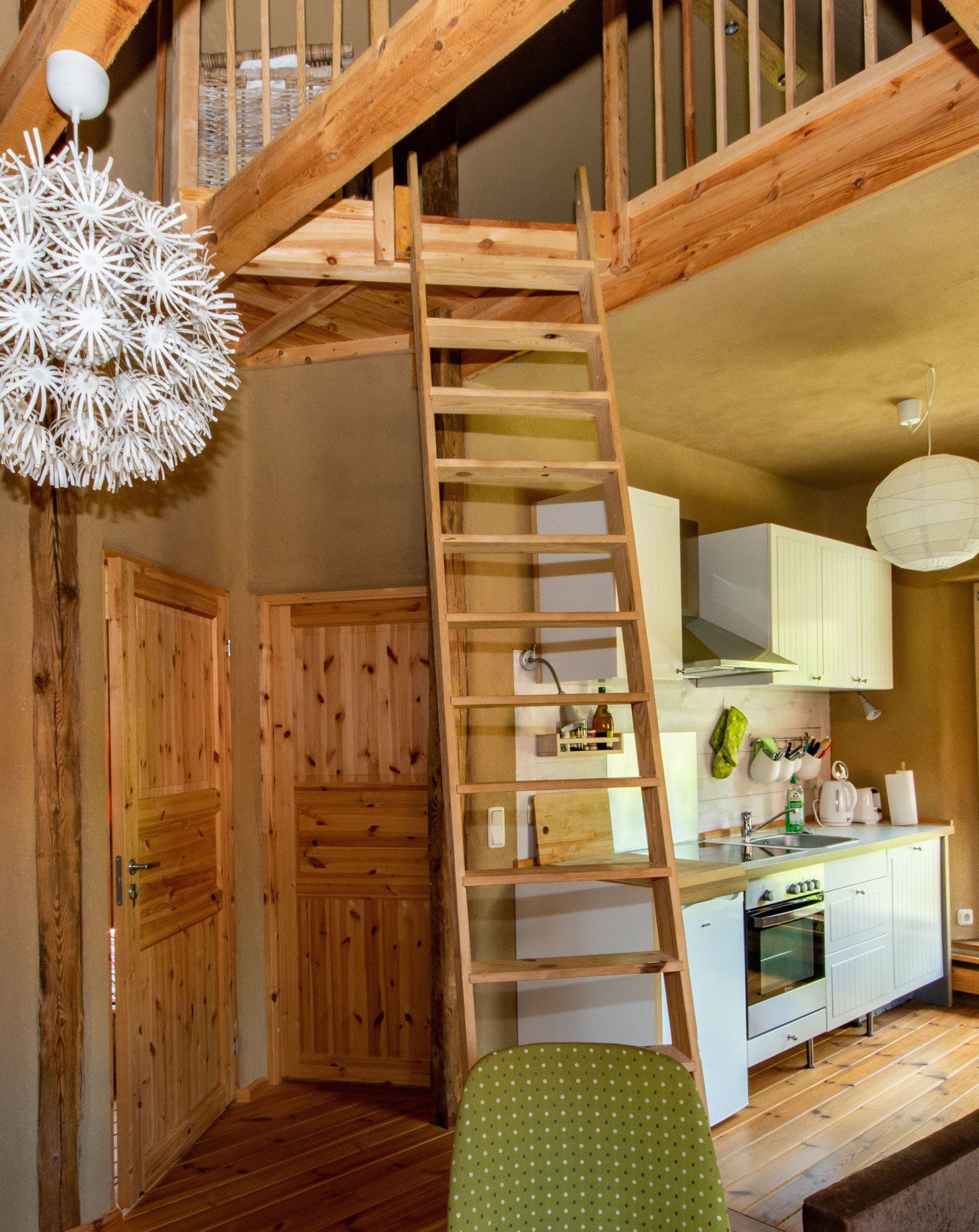 Über eine Raumspartreppe können von hier zwei Gäste in ihr Bett auf den Schlafboden gelangen. Die Schlafzimmer und der Schlafboden sind somit separat zugänglich. Die beiden Schlafzimmer sind mit jeweils einem Doppelbett ausgestattet. Wobei in einem sowohl der Lattenrost als auch die Matratze bodentief angeordnet sind. Diese "Schlafhöhle" ist daher besonders für die ganz jungen Gäste geeignet.